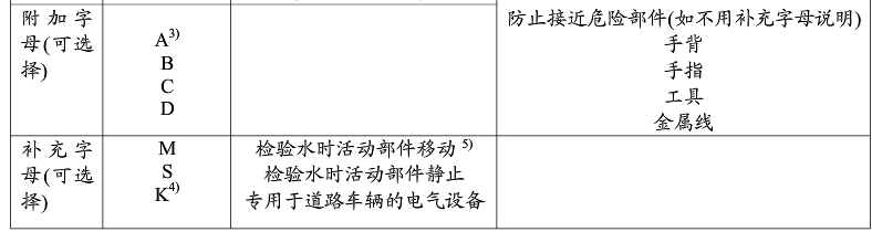 注:用補充字母K來表示道路車輛對防塵(第一個數字5和6)與防水(第二個數字4、6和9)的特殊規定。