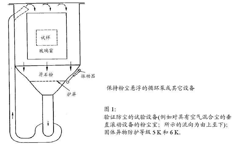對具有空氣混合塵垂直流向的5K和6K級固體防護(防塵或塵密)驗證用的試驗裝置。也可根據DINV 40046-48,商定采用水平流向的粉塵室(如圖2)。
